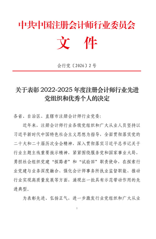 近日,收到中共中國注冊會計師行業(yè)委員會文件《關(guān)于表彰2022-2025年度注冊會計師行業(yè)先進(jìn)黨組織和優(yōu)秀個人的決定》,我所主任會計師吳林海同志榮獲注冊會計師行業(yè)“優(yōu)秀黨務(wù)工作者”稱號。 此次榮獲“優(yōu)秀黨務(wù)工作者”稱號,不僅是對其個人工作的認(rèn)可,也是對我所黨建工作的高度肯定。 我所將以此次獲獎為契機(jī),進(jìn)一步加強(qiáng)黨建工作,深化黨建與業(yè)務(wù)融合,提升服務(wù)質(zhì)量,堅守職業(yè)道德,不斷增強(qiáng)服務(wù)國家戰(zhàn)略、服務(wù)經(jīng)濟(jì)發(fā)展、服務(wù)社會公眾的能力。 附件: